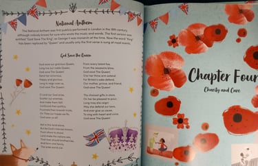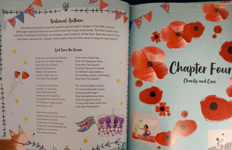 Union flag bunting fills every page as “granny” toasts “Her Majesty’s 70th Jubilee.” Children are given a glossary featuring terms like British Empire, National Anthem, and commemoration — yet there is no mention of colonial violence, empire, or why many countries sing about their people and land rather than asking a god most Britons no longer believe in to save an unelected billionaire who hid wealth in offshore accounts.