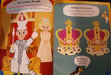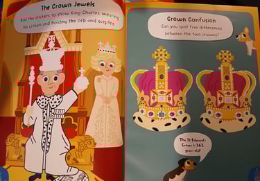 The King’s Coronation Sticker Book (Marion Billet): Children dress the King for his golden carriage but learn nothing about where the crown jewels came from.