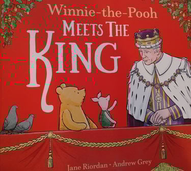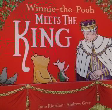 In Winnie-the-Pooh Meets the King by Jane Riordan and Andrew Grey, children are shown royal guards, crown jewels, and cheering crowds. The crowd excitedly shouts, “Three cheers for the King!”