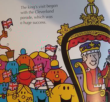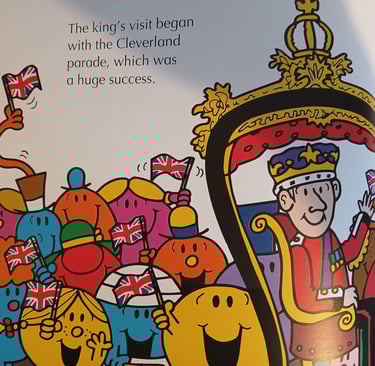 In Mr Men and Little Miss: The New King, the town is painted and polished ahead of Charles’s arrival. Everyone wants to sit with him at the banquet — especially Mr Snooty, of course.