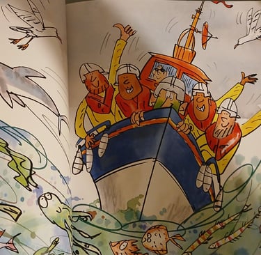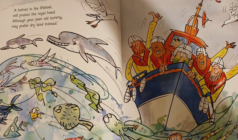 In The King’s Hats by Sheila May Bird, Charles is depicted as overworked and insecure, worried he cannot live up to his “extraordinary” mother. We see him dancing in gardens, donning different hats on royal visits, even wearing a helmet while promoting the RNLI.