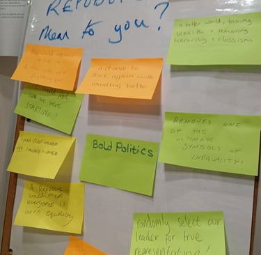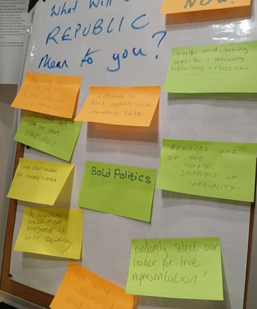 Our stall attracted a constant stream of visitors, many eager to learn more about our vision for a fairer, more democratic UK. We invited attendees to answer the question “What will our republic mean to you?” using post-it notes — and key themes emerged loud and clear: